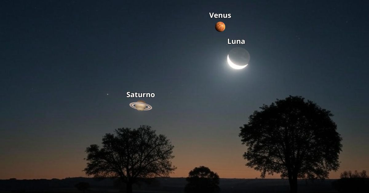 Para disfrutar de la conjunción Luna-Venus no requiere mucha ciencia, simplemente debes salir al atardecer y mirar al oeste. A medida que la luz del Sol se va ausentando, aparecerán tres puntos brillantes en el cielo: Saturno, la Luna y Venus. Tal y como se observa en la siguiente imagen, los tres objetos celestes aparecen bajo el horizonte y su elevación dependerá del hemisferio donde te encuentres: